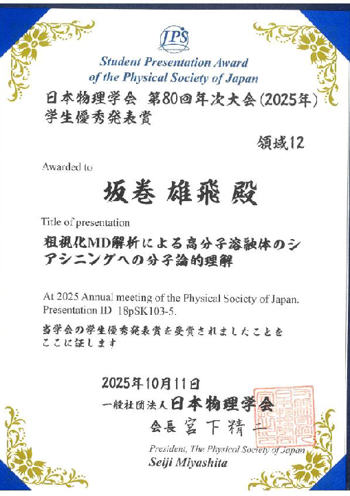 坂巻雄飛君(M2)が2025年日本物理学会学生優秀発表賞を受賞