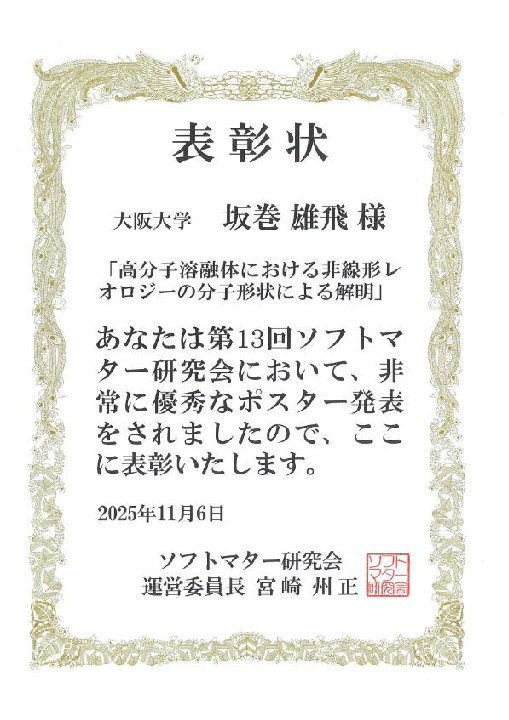 坂巻雄飛君(M2)が第13回ソフトマター研究会でポスター賞を受賞
